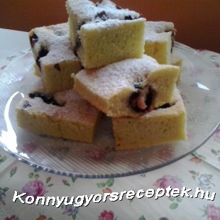 A cukrot a tojással robotgépben fehéredésig keverjük. Hozzáadjuk a sót, olajat majd a forró vizet. A lisztet lassan hozzákeverjük és az elkészült tésztát sütőpairral bélelt közepes tepsibe tesszük. A tészta tetejére szórjuk a cukorral elkevert magozott meggyet és 200c fokon kb 20 percig sütjük.