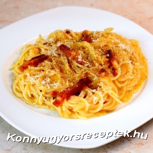 A kifőtt tésztát beleforgatjuk a pirított szalonnába. Összekeverjük, majd ráöntjük a tojásos keveréket, és a tészta főzővizét, és ha kicsit kihűlt a serpenyő, picit visszarakjuk a tűzre.