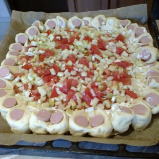 3. Az üres részt lekenem a tejföllel, meg, ráteszem az apró darabokra vágott sonkát, virslit, paprikát, paradicsomot, hagymát, megszórom a reszelt sajt keverékével, majd előmelegített 180 fokos légkeveréses sütőben 15 percig sütöttem.