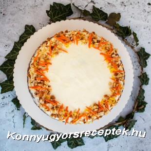 Amíg hűl a tészta, el tudjuk készíteni a krémet. A porcukrot a vajjal habosra keverjük és hozzáadjuk a mascarponét. A kihűlt tortaalapra kenjük és durvára vágott dióval, vékonyra szeletelt répa és citromhéj darabokkal díszíthetjük.