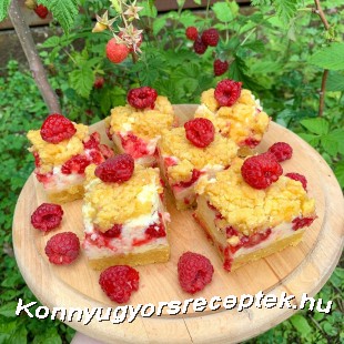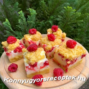 4. A krémet eloszlatjuk a kihűlt tészta tetején, majd beledobáljuk a málnát és ráreszeljük a tészta másik részét.