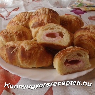 A tészta hozzávalóit a ( margarin kivételével) össze dolgozzuk, letakarva kb. 1-2 órára a hűtőbe tesszük. Utána a tésztát 8 gombócra osztjuk, egyenként kerek lappá nyújtjuk, és mindegyik lapot megkenünk olvasztott margarinnal. Egymásra helyezzük őket. A tetejére tésztalap kerül. Óvatosan nagy kerek lappá nyújtjuk, és 12-14 cikkre osztjuk. A szélesebb felére teszünk egy kis szelet sonkát, rá egy sajtot, majd feltekerjük kifli formára. Sütőpapírral bélelt tepsibe tesszük, és egy éjszakára a hűtőbe tesszük. Másnap reggel lekenjük tojással, megszórjuk reszelt sajttal, és hideg sütőbe téve 180 C fokon szép pirosa sütjük.( kb. 30-35 perc)