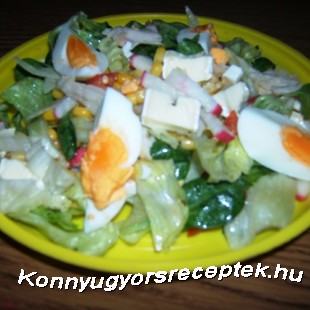 Harmadik lépés: A tojást miután megfőtt felszeleteljük és a saláta tetejére helyezve tálaljuk
