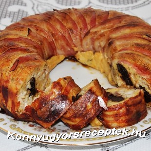 3. Legfelső réteg burgonyát megsózzuk, ráöntjük a tejjel elhabart tojást, beborítjuk vékony szalonnaszeletekkel és forró sütőben megsütjük.