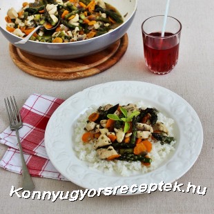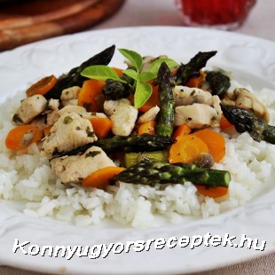 A csirkemellet vágjuk fel ízlés szerinti kockákra. A spárga szárát hajlítsuk meg, hogy a fás része letörjön, majd vágjuk fel kb. két centis darabokra, és a bimbókat tegyük félre. A sárgarépát pucoljuk meg, majd vékonyan karikázzuk fel. A lila hagymát pucoljuk meg, majd vágjuk fel nagyobb kockákra. A bazsalikomot és a petrezselyemzöldet vágjuk fel apróra.