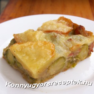 Amikor egy kicsit besűrűsödött, átöntjük a kivajazott tepsibe, rátesszük a sült krumpli karikákat és rászórjuk a maradék reszelt sajtot. Betesszük a sütőbe 20-25 percre, amíg szépen megpirul a teteje.