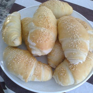 Az öszes hozzávalókat robotgép dagasztotta meg, kb 10 perc alatt. Kelesztőtálban kelt egy óra hosszáig. Lisztes deszkára borítottam a tésztát, majd 9 darabra szétvágtam. Először ugy gömbölyítettem mint egy zsömlét, majd nyújtófával hosszúkásra kinyújtottam. Utána a kinyújtott tészta egyik felét ráhajtottam a másikra, s a magam felőli részénél elkezdtem fektekerni úgy, hogy a jobb kezemmel a hozzám távolabb eső végét húztam, (nyújtottam).