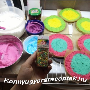 7. Összeállítjuk a tortánkat: egy lap sárga-zöld piskóta, egy réteg krém. Egy lap kék-pink piskóta, egy réteg krém. Addig folytatjuk a rétegezést amíg elfogy a krém és az utolsó piskótalapot is a tetejére tettük.