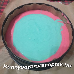 3. Két 30 cm-es kapcsos tortaformát kibélelünk. Az egyikbe beletöltjük a pink piskóta alapot, közepébe öntve a kéket, a másik formába a zöldet, közepébe öntve a sárga piskóta alapot.