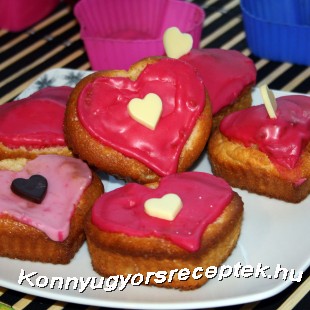 5. A tetejét díszítjük úgy, hogy 10 dkg porcukrot 2-3 evőkanál citromlével elkeverünk és ételszínezékkel rózsaszínre, vagy pirosra színezzük. A mázzal szíveket rajzolunk a muffinokra.
