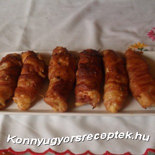 A csirkemell filét 6-7 darabba vágjuk, enyhén ki klopfoljuk. Sózzuk, borsozzuk. Kiterítve ráterítünk egy szelet sonkát, egy szelet sajtot, feltekerjük, és baconba csomagoljuk. Zsírozott tepsibe egymás mellé fektetjük, fóliával letakarva 30-35 percig sütjük 200 C fokon. A fóliát levéve még addig sütjük, amíg a bacon szép pirosra sül. Bármilyen körettel tálaljuk.