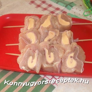 A csirke mellett 5-6 szeletre vágjuk, kicsit kiklopfoljuk sózzuk, borsozzuk. Egy alufóliára egymás mellé fektetjük. ( fedjék egymást a szeletek). Rá terítünk egy sor sonkát, egy sor sajtot.,és a fólia segítségével feltekerjük. Egy kis időre a hűtőbe tesszük. Kitekerjük a fóliából, és kb. két ujjnyi vastag szeletekre vágjuk, és saslik pálcára 3-4 tekercset feltűzünk. Tojásba mártjuk, megszórjuk zsemlemorzsával, és sütőpapírral bélelt tepsibe téve 180 C fokon szép pirosra sütjük. ( kb. 40-45 perc). Tetszés szerinti körettel tálaljuk.
