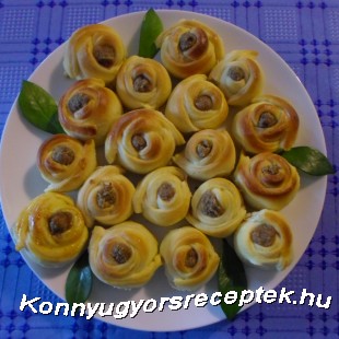 A köröket bevágjuk 4 felé úgy, hogy ne érjenek össze a vágások, helyet hagyva a tölteléknek. Közepébe tesszük a diós tölteléket. Felhajtjuk az egyik oldalt, hogy átölelje a tölteléket, majd a szemközti oldalt szintén, mely már az előző oldalt is átöleli, majd a másik kettőt is felhajtjuk ugyanígy.