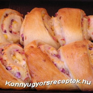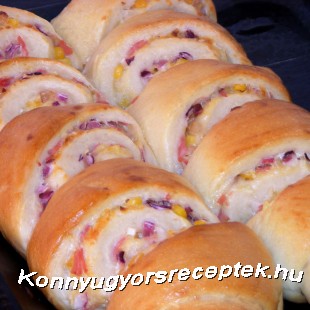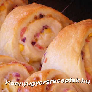 Megfelezzük a tésztát, vékonyra kinyújtjuk, megkenjük zúzott fokhagyma és tejföl keverékével, majd ráhalmozzuk a sonkát, bacont, hagymát, kukoricát, sajtot és feltekerjük.