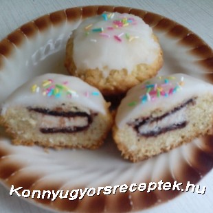 A túró rudikat 4 felé vágjuk, s rárakunk a tésztákra 1-1 kis túrórudi db-ot, s ezekre kanalazzuk a tészta többi részét.
