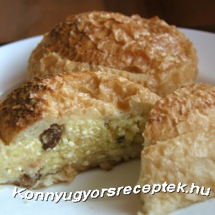 Elkészítjük a tölteléket: a cukrot a tojással kikeverjük, az áttört túrót és a kivett zsemlebelet hozzámorzsoljuk és jól elkeverjük. A mazsolát a pohárban átmossuk és a túróhoz adjuk.