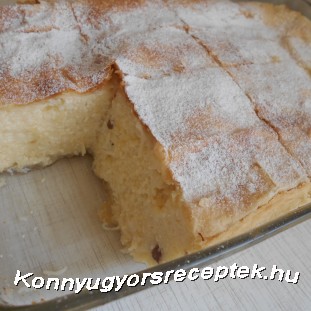 A tojások fehérjéjét a maradék cukorral habbá verjük. A túrós keveréket összeforgatjuk a kiáztatott, lecsöpögtetett mazsolával és a cérnametélttel, majd óvatosan hozzákeverjük a