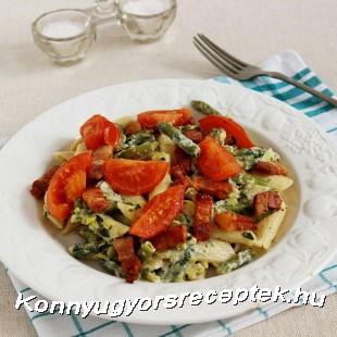 Tálaláskor halmozzuk tányérra a zöldbabos tésztát, szórjuk meg a pirosra sült császárszalonnával, tegyünk rá a sült paradicsomból, majd úgy kínáljuk.