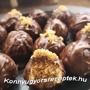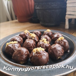 Gőz felett megolvasztjuk a csokit, elkeverjük olajjal és villával belemártjuk a golyókat. Megszórjuk dióval és sütőrácsra helyezve hagyjuk a felesleges csokit lecsepegni róla.