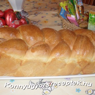 Kis cukros tejben felfuttatjuk az élesztőt, majd a többi hozzávalóval tésztát dagasztunk belőle. Duplájára kelesztjük. Ha megkelt, két részre osztjuk. Mindkét tésztát 3 vagy négy részre vesszük, kisodorjuk, megkenjük olvasztott zsírral, feltekerjük mint a bejglit, és összefonjuk. Én 4-es fonással csináltam. Sütőpapíros tepsibe fektetjük, ismét a duplájára kelesztjük. Tetejét megkenjük tojással, és 180 C fokos sütőben szép pirosra sütjük. ( gőzös sütőben)