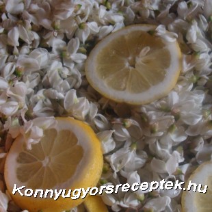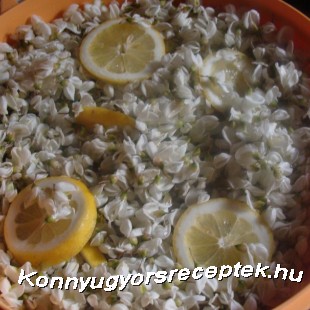Az akácvirágot a vízzel citromsavval,karikára vágott citrommal,elkeverjük, és 24 órát állni hagyjuk, közben többször megkeverjük.