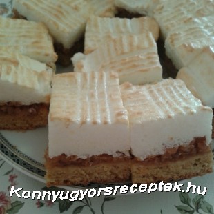 A tészta hozzávalóit összegyúrjuk, a kinyomkodott, ízesített reszelt almát rátesszük, majd 180 fokos sütőben kb. 20-25 percig sütjük. Amikor a tészta megsült, a felvert tojásfehérjét rákenjük, majd pár percre a sütőbe újra betesszük addig, amíg a teteje egy picit megkeményedik. Ízletes, és nem hizlaló süti. A tepsi mérete: 35x25 cm.