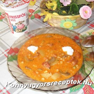 A karikára vágott kolbászt serpenyőben pirítani kezdtem, amikor már kissé kisült a zsírja, rádobtam a gombát is. Együtt pároltam, majd zsírjára sütöttem. Amikor a levesben a zöldségek megpuhultak, hozzáadtam a kolbászos gombát, és további 5 percig főztem. A tejfölt belehabartam, a levest ezután 1-2 percig főztem, majd az apróra vágott petrezselyemmel meghintve tálaltam.