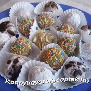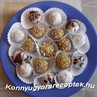 A tésztából golyókat formázunk, majd ízlés szerint fahéjas porcukorba, cukorkába, csokireszelékbe forgatjuk, vagy olvasztott csokoládéval lecsurgatjuk.