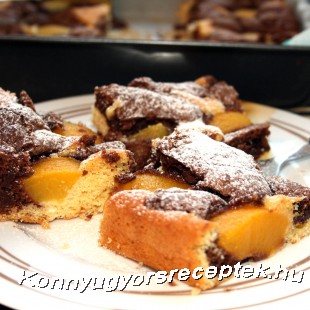 A sütőt 180 C-fokra előmelegítjük. Közepes méretű tepsit kibélelünk sütőpapírral, belesimítjuk a sárga tésztát, és evőkanállal rászedjük a csokis tésztát. A tetejét kirakjuk 10 fél lecsöpögtetett sárgabarackkal, és a sütőben kb. 30 perc alatt megsütjük.