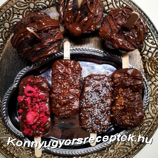 5. A kihűlt sütiket szilikon formájukban 30 percre fagyasztóba tesszük, majd olvasztott csokoládéba mártjuk, rácsra helyezzük, meghintjük szórócukorral és hagyjuk a csokit rádermedni.