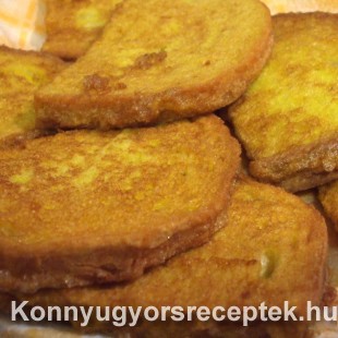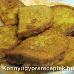 A kenyérszeleteket belemártom a tojásba. Forró olajban, egy teflon serpenyőben aranysárgára sütöm.