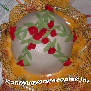 A tálból egy tálcára kiöntött tortára ragasztom lekvárral. Tetszés szerint marcipánnal díszítem.
