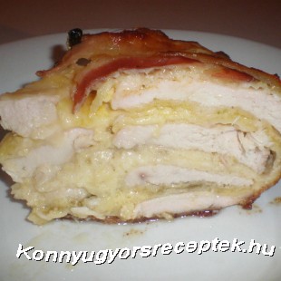 Befűszerezem. Rétegenként egyfajtával fűszerezem vagy sóval vagy delikáttal. Addig sorozom a melleket és a sajtot míg fér a tálba. Az utolsó réteg tetején sajt legyen. Beborítom teljesen a kilógó szalonnával. Előmelegített sütőben megsütöm kb. 30-35 percig alufólia alatt majd azt levéve még 30-35 percig