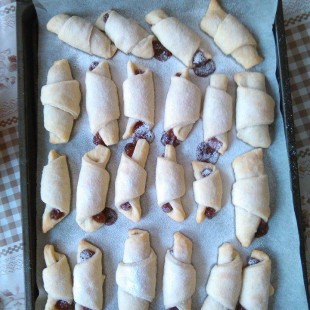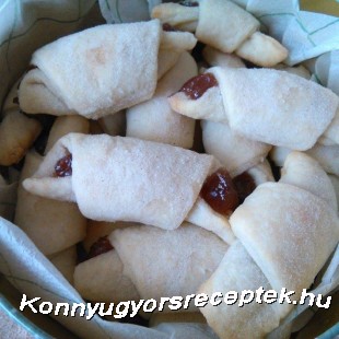 A hozzávalókat összegyúrjuk, majd fél órára hűtőbe tesszük. Utána lisztezett deszkán kinyújtjuk , majd háromszögeket vágunk belőle. Eperlekvárral töltjük, majd kiflikre tekerjük fel. Világosra sütjük. Fahéjas porcukorral szórjuk meg.