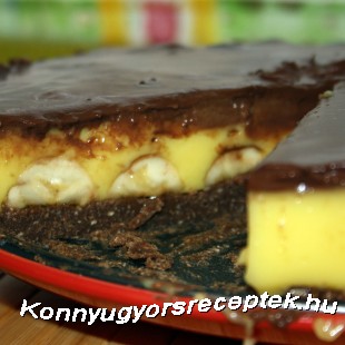 4. A banánokat hosszában félbevágjuk, a banáncsíkokat a megszilárdult kekszlapra helyezzük. A két krémből felváltva kanálnyi mennyiségeket teszünk rá, majd egy kanállal márványozzuk. Alaposan kihűtjük, hogy a krémek megszilárduljanak.