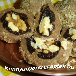 4. Vegyünk egy kanálnyit a kihűlt masszából és az aszalt szilvás diókat fedjük be vele. A gombóckákat hempergessük meg darált dióba.