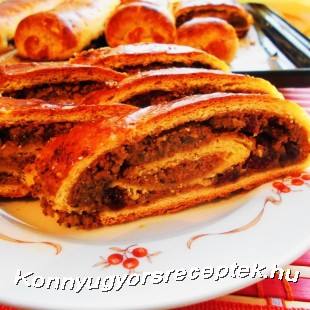 A pihent tésztát 2 fele osztjuk, kigömbölyítjük, kinyújtjuk kb. 23 x 28 cm. Megtöltjük a töltelékekkel úgy, hogy a szélén körben 1 cm hely maradjon üresen. A rövidebbik oldalon felhajtjuk kissé a tésztát és a hosszabbik oldalról kezdve feltekerjük.