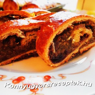 A pihent tésztát 2 fele osztjuk, kigömbölyítjük, kinyújtjuk kb. 23 x 28 cm. Megtöltjük a töltelékekkel úgy, hogy a szélén körben 1 cm hely maradjon üresen. A rövidebbik oldalon felhajtjuk kissé a tésztát és a hosszabbik oldalról kezdve feltekerjük.