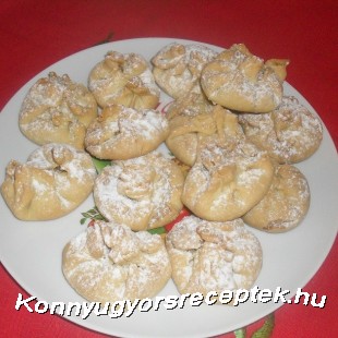 A tésztát vékonyra nyújtjuk , közepes pogácsa szaggatóval kiszúrjuk. Közepükbe egy-egy teáskanálnyi diós tölteléket helyezünk. Széleit összefogjuk, mint egy zsákot.