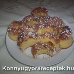 A tojások sárgáját a cukorral és olvasztott margarinnal habosra keverjük, majd kemény habbá verjük a tojások fehérjét. A lisztet elkeverjük a sütőporral, és lassan adagolva felváltva a fehérjehabbal a tojássárgás masszához keverjük. Következő lépésként a masszát egy magas falú zsírozott-lisztezett vagy sütőpapíros tepsibe öntjük, tetejét megszórjuk a durvára vágott dióval, és előmelegített, mérsékelt hőfokú sütőben megsütjük. Sütés után tálcára borítjuk, hűlni hagyjuk, majd ezután egy pogácsaszaggatóval félholdakat szaggatunk belőle, de éppen tetszés szerinti alakúra is vágható, rombusz alakra, vagy egyszerű szeletre, ki hogyan szereti. Ezt az adagot egy 32x23 cm-es méretű tepsiben sütöttem, 5 cm-es volt a magassága. Ebből is sok lett, természetesen ha valaki többet szeretne készíteni, a hozzávalók mennyiségét emelni kell. Esetleg tálaláskor diszkréten meg lehet még porcukorral szórni.
