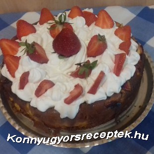 Beleöntjük a tortaformába, megszórjuk a tészta tetejét apró kockára vágott eperrel, 20 dkg-ot hagyunk a díszítésre.