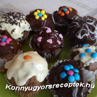 Gőz fölött olvasszuk fel a csokoládékat. A muffinokat mártsuk bele az étcsokoládéba, vagy tetszés szerint a fehércsokoládéba, majd díszítsük őket cukorkákkal.