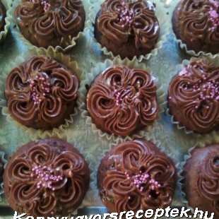 A muffint a szokott módon elkészítjük. Hagyjuk kihűlni. A margarint, a porcukrot és a kakaót habosra keverjük. Habzsákba töltjük és csillagos végű csővel virágokat nyomunk a kihűlt muffinokra, végül rózsaszínű dekorgyönggyel megszórjuk.