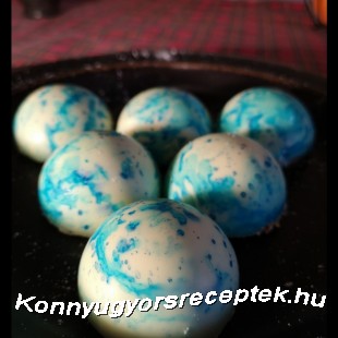 A forma mélyedéseibe az ételfestékkel ecsetvonásokat húzunk, majd amikor a csoki felolvadt, egy-egy evőkanállal szilikonos félgömbforma mélyedéseibe töltünk, majd körkörös mozdulatokkal a levegőben elegyengetjük a félgömböcskékben az olvadt csokit.
