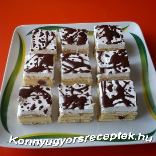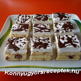 A pudingport a cukorral és a tejjel csomómentesre keverjük, majd tűz felett besűrűsítjük. A tűzről levéve belekavarjuk a zselatint és egy alufóliával letakarva megvárjuk amíg meghűl. ( időközönként megkevergetjük) Amikor meghűlt beletesszük a mascarponét és a meggyet, majd jól összekeverjük a krémet. Egy tálcára egymás mellé helyezzük a vajas kekszeket, rákenjük a krémet.A tejszínt kemény habbá verjük, és a krém tetejére kenjük. A csokoládét az olajjal gőz fölött megolvasztjuk, és a tejszínhabra csurgatjuk. Néhány órára tegyük hűtőbe!!!