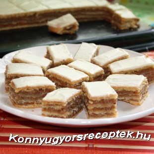 Az első adag tésztából lisztezett deszkán kb. 25x35 centis téglalapot nyújtunk, amit egy sütőpapírral bélelt tepsibe simítunk. Megkenjük a lekvár egyharmadával és megszórjuk a porcukorral elkevert dió harmad részével. Újabb réteg vékony tészta következik, majd a lekvár és a cukros dió második harmada, amire ismét egy réteg tészta-lekvár-dió réteg kerül. A tetejére borítjuk az utolsó réteg tésztát, amit megszurkálunk villával. 180 fokra előmelegített sütőben 20 perc alatt készre sütjük.