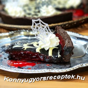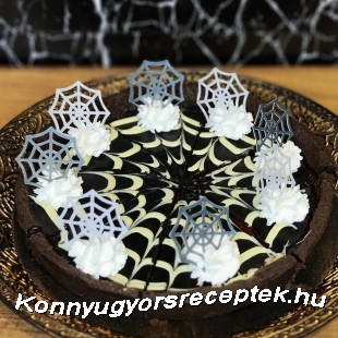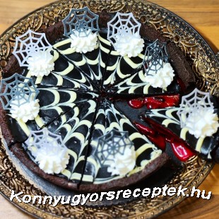 8. A hűtőből kivéve forró késsel 8 szeletesre vágjuk a piténket, széleikbe egy-egy tejszínhab halmocskát nyomunk és belenyomunk mindegyikbe egy ostya pókhálót. Fogyasztásig hűtőben tartjuk.