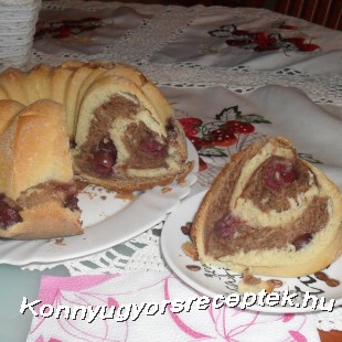 Az élesztőt felfuttatjuk, a többi hozzávalóval összedolgozzuk.Kétfelé vesszük a tésztát, az egyikbe 2 kanál kakaót gyúrunk. Kelesztőtálba téve duplájára kelesztjük. A fehér tésztát kinyújtjuk, megszórjuk magozott meggyel, rá a kakaós lap, szintén meggyel szórva, feltekerjük, és vajjal kikent liszttel meghintett kuglóf formába tesszük. Megint keleszteni, majd 150 C fokos sütőben kb. 1 órán keresztül sütjük.