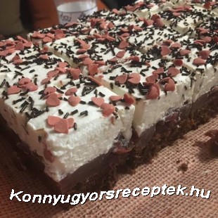 A tejszínhabot felverjük keményre. Ha kihűlt a tészta, rákenjük a krémet, a tetejére simítjuk a habot, végül a tetejét megszórjuk reszelt csokoládéval vagy cukordekorral.