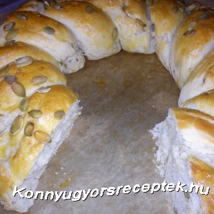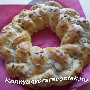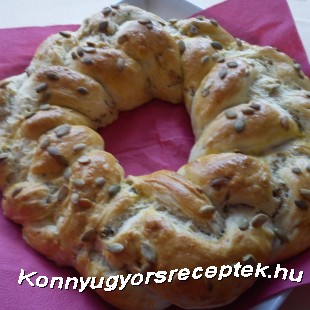 Langyos vízzel elkeverjük a cukrot, 1 ek lisztet, és az élesztőt, majd langyos helyre tesszük és hagyjuk felfutni. A maradék lisztet átszitáljuk, és elkeverjük a sóval, a tökmag felével, a zúzott fokhagymával valamint az olvasztott margarinnal. Ezt követően hozzáadjuk a felfuttatott élesztőt, és jól összedolgozzuk. A tésztát letakarjuk, és langyos helyen a duplájára kelesztjük. Amikor a tészta megkelt, lisztezett deszkára tesszük, és három egyenlő részre osztjuk. Először cipókat készítünk, majd vékony rudakat sodrunk belőlük, és hármas fonással összefonjuk a szálakat, melyből végül egy koszorút készítünk. Sütőpapírral bélelt tepsibe tesszük, tetejét megkenjük tojással, rászórjuk a megmaradt tökmagot, és előmelegített sütőben 180 fokon 30-35 perc alatt aranybarnára sütjük.